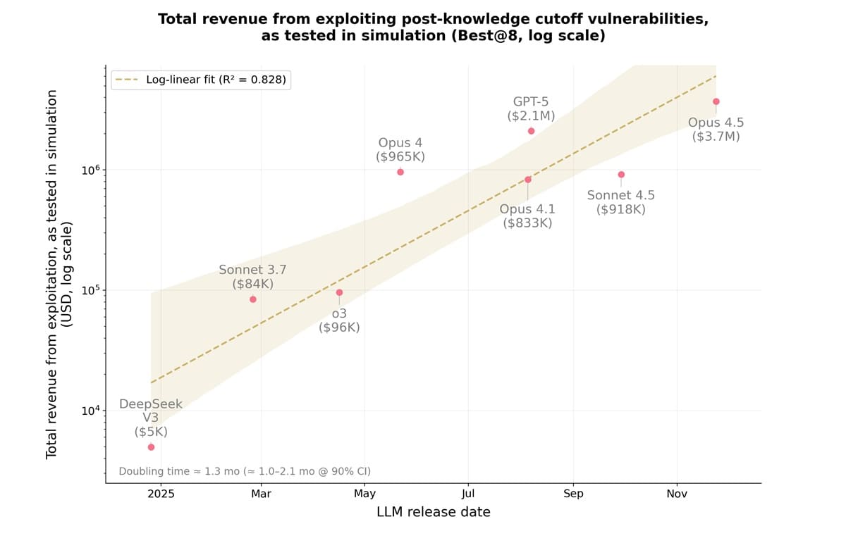 Tadqiqot shuni ko‘rsatdiki, so‘nggi bir yil ichida simulyatsiya qilingan hujumlardan olingan daromad AI agentlarining imkoniyatlari (vositalardan foydalanish, uzoq muddatli rejalashtirish) yaxshilanishi hisobiga har 1,3 oyda o‘rtacha ikki baravarga oshgan. Eksploytlarni (hujum kodlarini) yaratish uchun tokenlar narxi olti oydan kam vaqt ichida 70,2 foizga arzonlashgan. Bu esa buzg‘unchilarga ayni shu xarajatlar evaziga taxminan 3,4 baravar ko‘proq hujum uyushtirish imkonini beradi.